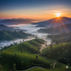 The clouds, which had seemed so formidable just moments ago, now parted and danced with the light, creating an ethereal canvas. Below us, a sea of clouds stretched as far as the eye could see, a fluffy white blanket covering the valleys. As the sun climbed higher, its golden rays pierced through, illuminating the rolling hills of the tea plantations. It felt like we were literally floating above the clouds, watching the world awaken beneath us.