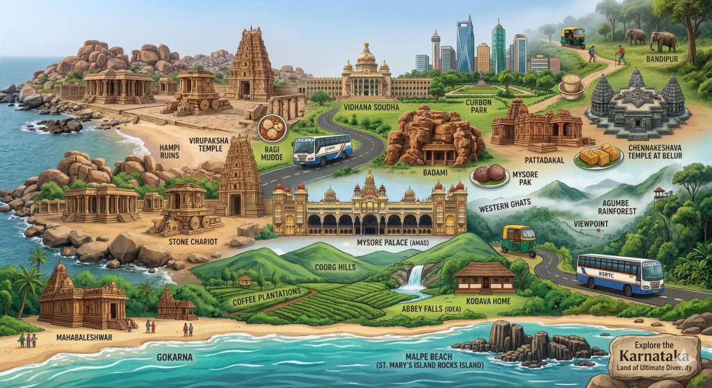 Karnataka is one of those states that quietly surprises you. From ancient ruins to misty hills and vibrant cities, it offers a little bit of everything.